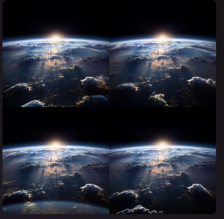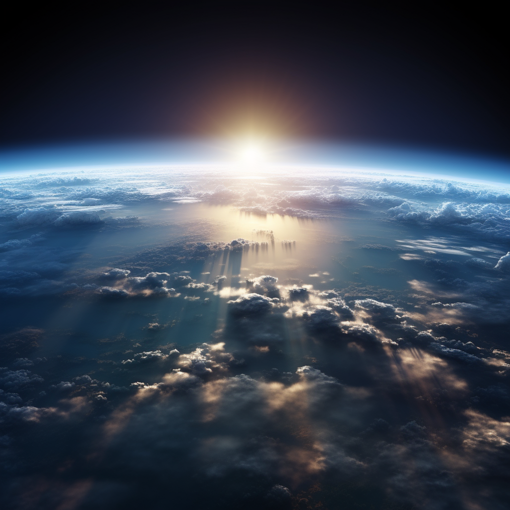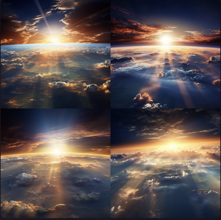 Prompt 1: the earth from space, mostly covered in clouds with the sun rising behind it