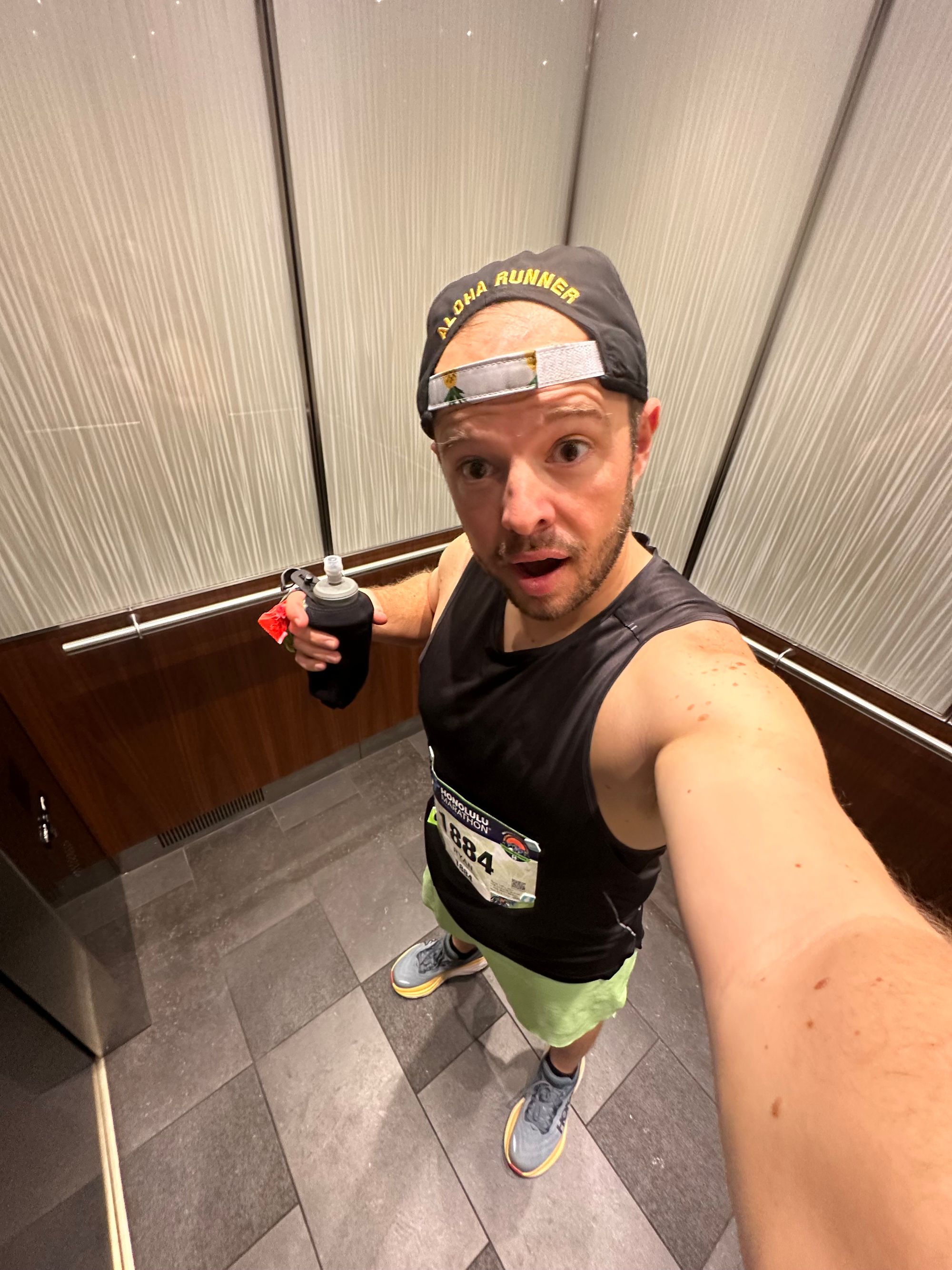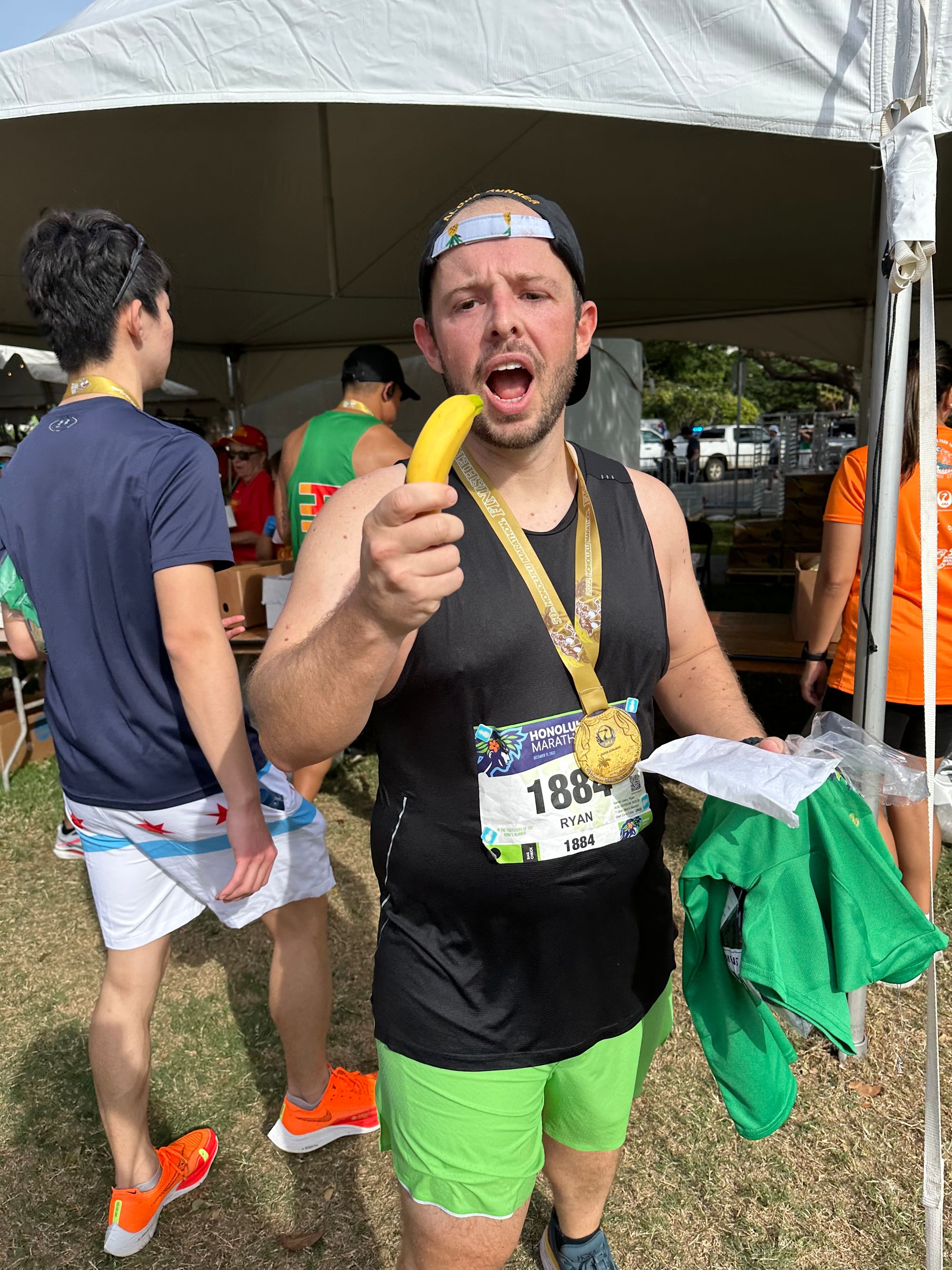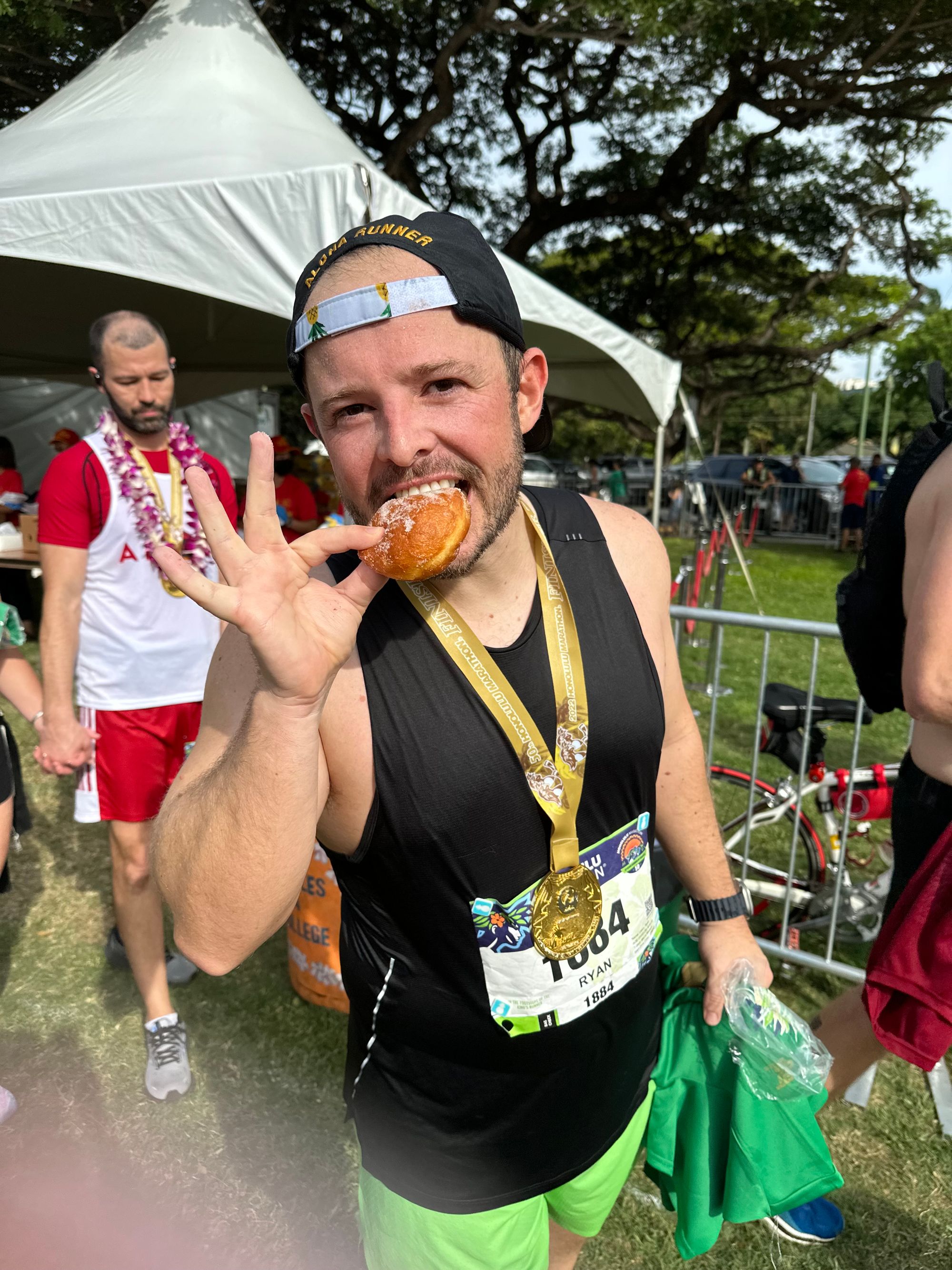 I ate a banana as quick as possible (nearly forgot to unwrap it), devoured the malasada, and chugged a coconut water. So good. I wanted to sit down for a minute, which Stephanie seemed worried I wouldn't be able to get up after, but wanted toe exhausted photo.